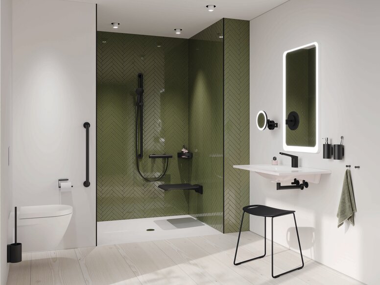 Die Sitzfamilie in Schwarz matt von HEWI eröffnet den Raum für Gestaltungsvielfalt und bietet erhöhten Komfort und Sicherheit im Sanitärraum.