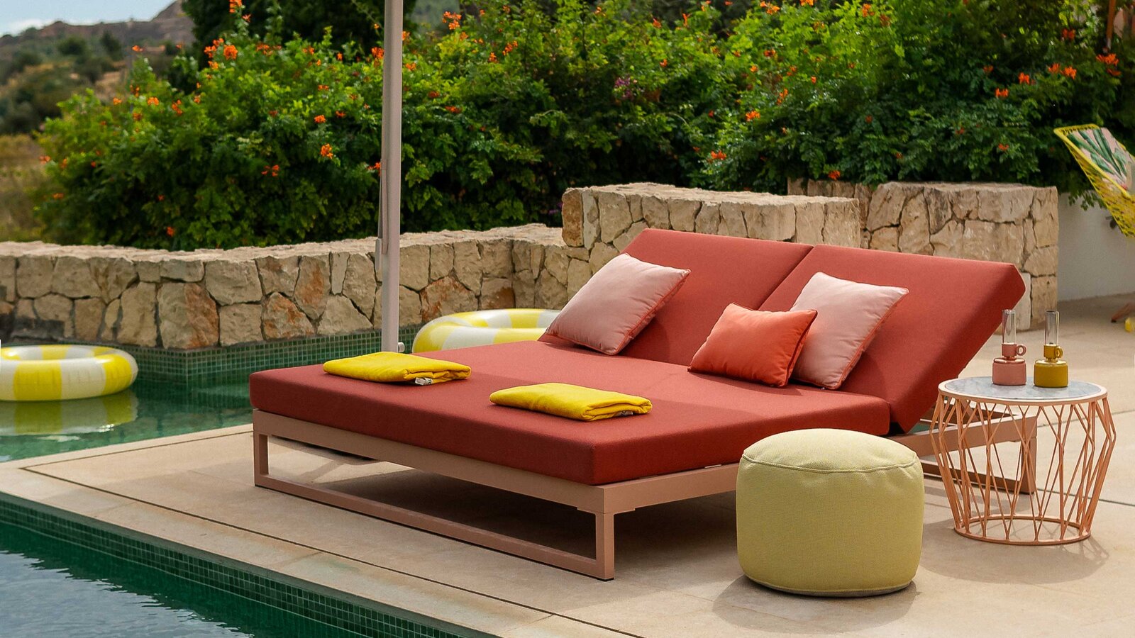 The high-quality interior design of the guest house puts colours centre stage. The combination of minimalist fittings, modern lines and large windows that open up the rooms creates a design concept that invites guests to dream. This modern house is surrounded by tall trees that offer protection from the Spanish sun, as well as the turquoise-blue Mediterranean Sea. The colour of the sun is reflected in various accents throughout the interior design of the holiday home. Whether in carpets, pillows, bedding or the iconic door handle 111 from HEWI in mustard yellow.