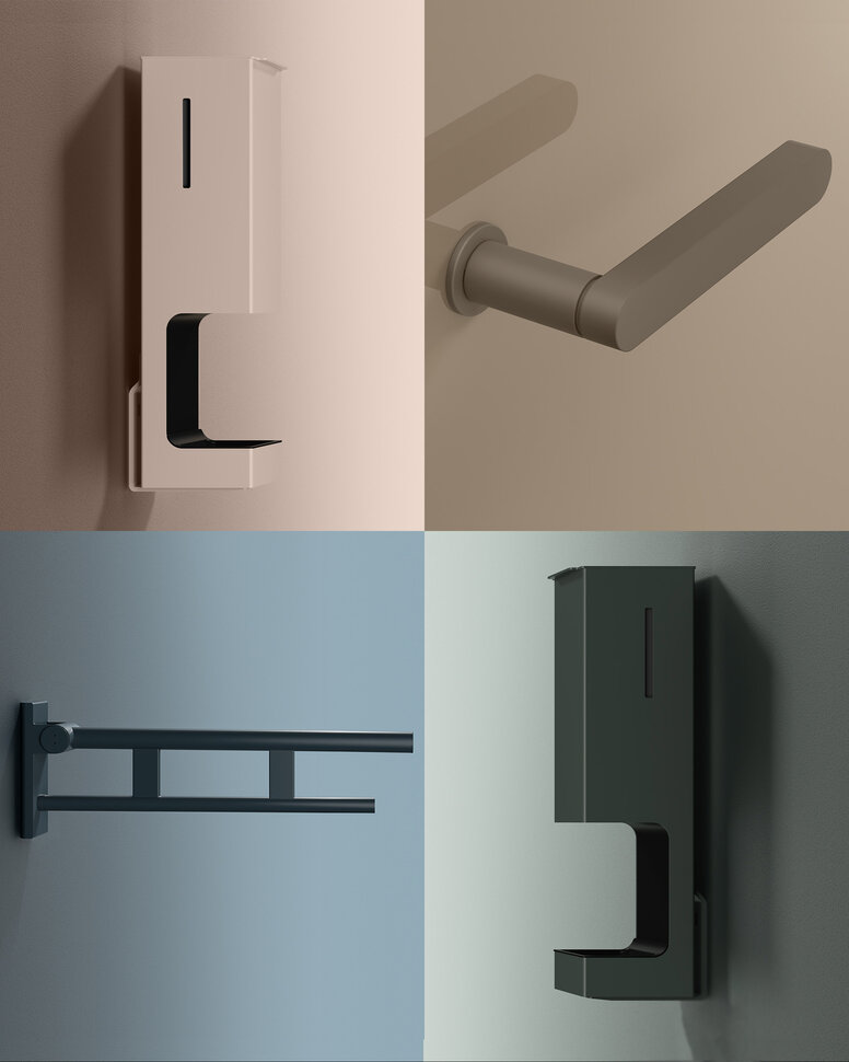 Fittings in your chosen colour are also available to match the individually powder-coated sanitary solutions. You can create unique room concepts from the door to the bathroom by combining System 270 handles with System 900
