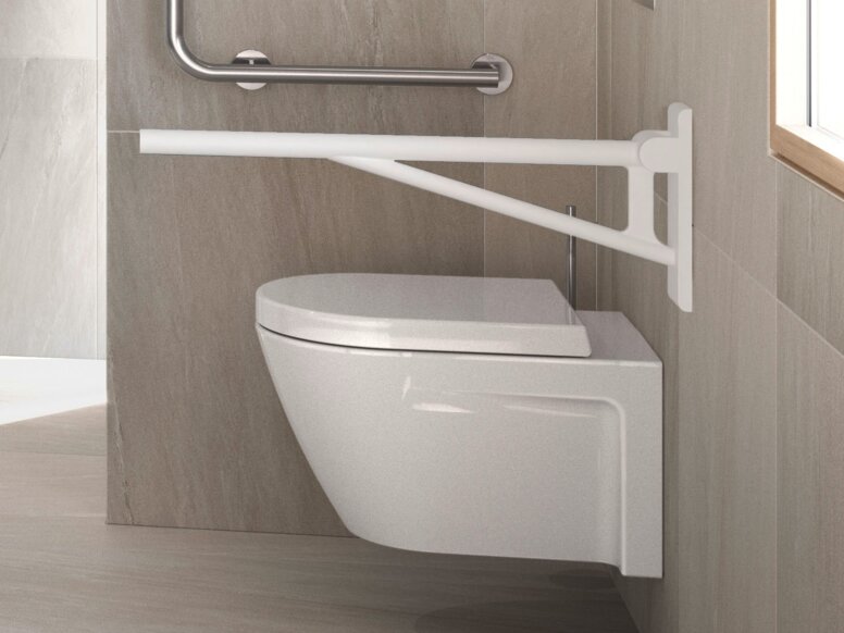 • Folding support handle Duo: This also has a round lower rail that provides optimum support for turning sideways onto the toilet