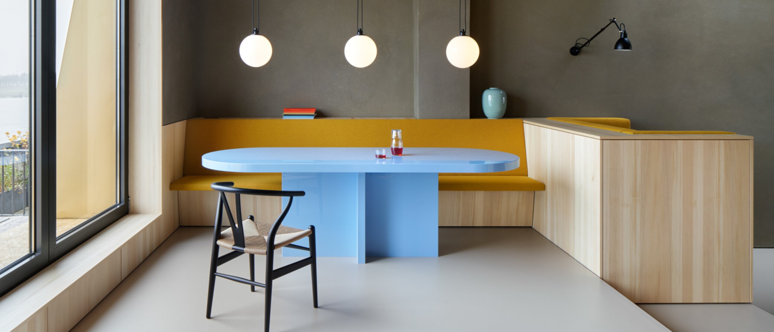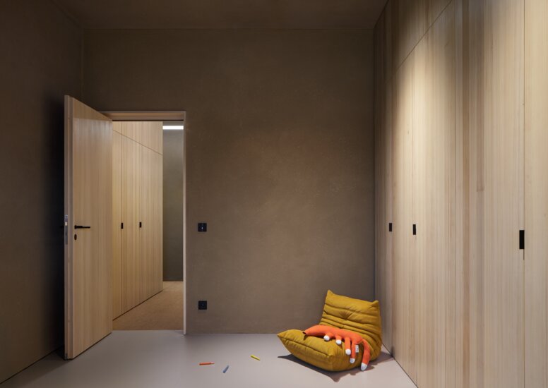 L’unité d’habitation de trois étages a été divisée de manière à ce que les espaces privés se trouvent au niveau de l’entrée. Ces espaces sont marqués par des matériaux naturels comme un crépi d’argile couleur olive et des bois régionaux. Un sol en caoutchouc couleur crème rappelle les sols sans joints des anciens bâtiments industriels et crée en même temps un lien harmonieux entre le crépi d’argile et le bois. On accède au deuxième niveau - l’espace de vie central - par une imposante cage d’escalier laquée en orange brillant. À cet étage, un coin repas avec une banquette recouverte de tissu et une table bleu clair crée une atmosphère accueillante et communicative. L’espace de vie lui-même s’ouvre sur une pièce de deux étages avec des fenêtres de grand format qui laissent entrer beaucoup de lumière naturelle et offrent une vue dégagée sur le Rhin. Différentes hauteurs de podiums assurent une sensation d'espace dynamique en séparant subtilement différentes zones de vie.