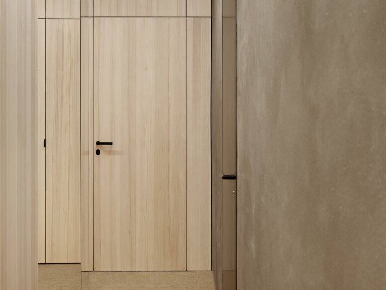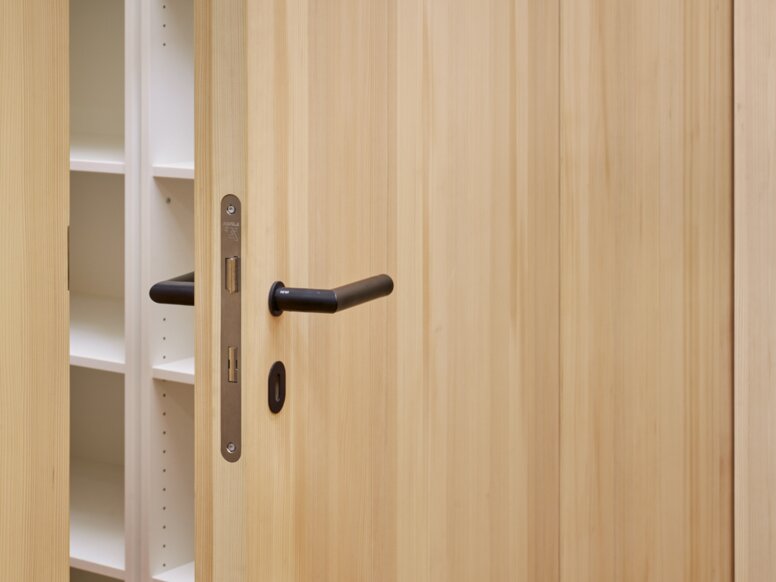 Pour les portes, le choix s’est porté sur les poignées de porte du système 162 de HEWI, qui dans leur version noir mat s’intègrent parfaitement dans le concept d’aménagement du loft. Le design épuré et minimaliste de la poignée de porte souligne le caractère moderne du bâtiment rénové et complète l’esthétique industrielle de l’entrepôt d’origine. En même temps, la surface noire mate crée un contraste délibéré avec les matériaux naturels comme le crépi d’argile et le bois, et suit le concept des autres touches décoratives marquantes comme la cage d’escalier laquée en orange. Ces détails illustrent comment des solutions de design bien pensées peuvent contribuer à l’harmonie entre l’ancien et le nouveau.
