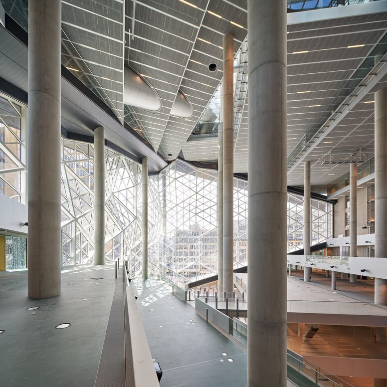 Passend weelderig en toch niet uit de tijd, maakt deze versneller van culturele verandering indruk. Donker getinte glasoppervlakken worden onderbroken door lichtere elementen in 3-D optiek. Filigraan zuilen ondersteunen brede uitkragende plafonds; bruggen, trappen en gangen verbinden de verschillende niveaus.