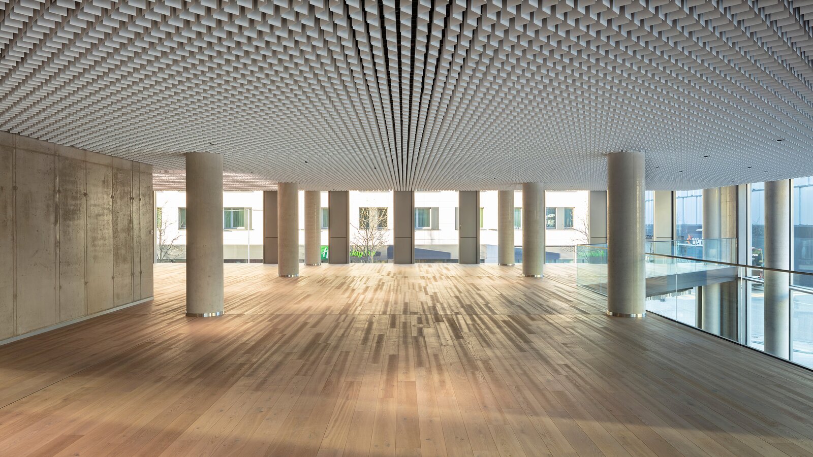 De overwegend glazen huid ontvouwt zich ook aan de binnenkant: Met zijn grote ramen van vloer tot plafond biedt het een adembenemend uitzicht over de hele stad en zorgt het met veel daglicht voor een vriendelijke en open loftsfeer. Zo krijgen de 2.500 medewerkers in de Stream Tower werkomstandigheden die veel ruimte bieden voor inspiratie, communicatie en innovatie. Ook de beginselen van duidelijkheid en materiaalreductie worden voortgezet: De kern van het gebouw, dat toegankelijk is via liften en trappen, is gemaakt van sierbeton; prachtige zwart-witte terrazzovloeren combineren elegantie met uitzonderlijke robuustheid.