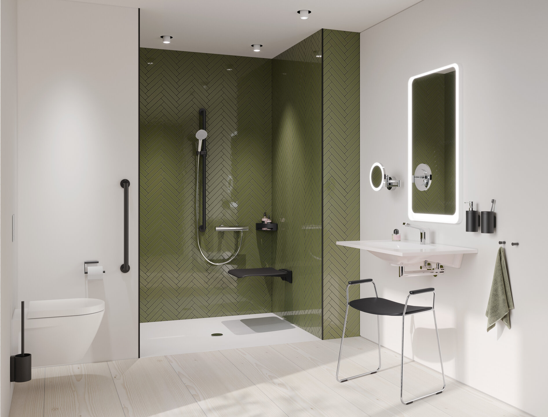 De zitkrukken en badstoelen zijn flexibel te plaatsen waar ze nodig zijn. In de kleuren bosgroen en antracietgrijs vormen de zittingen blikvangers in je badkamer.