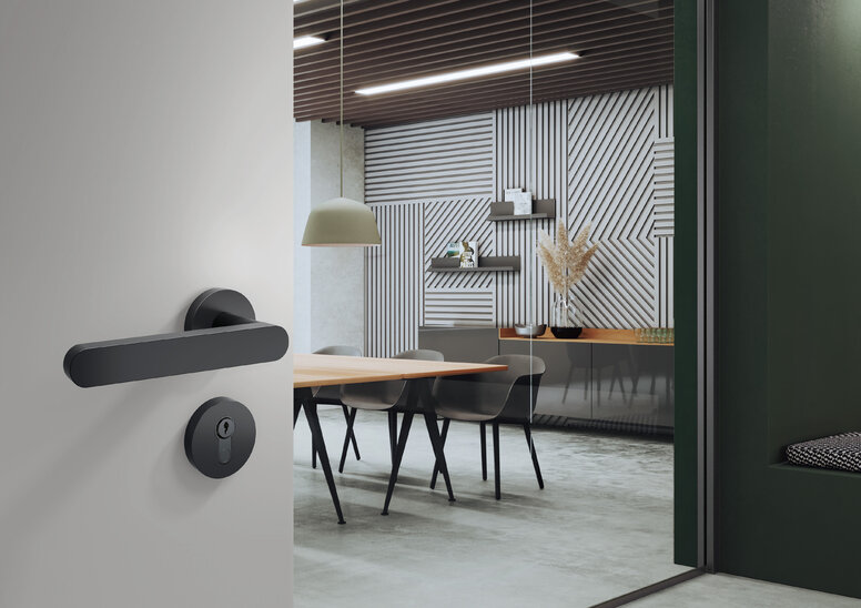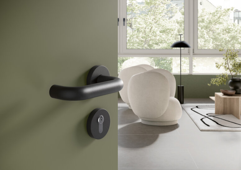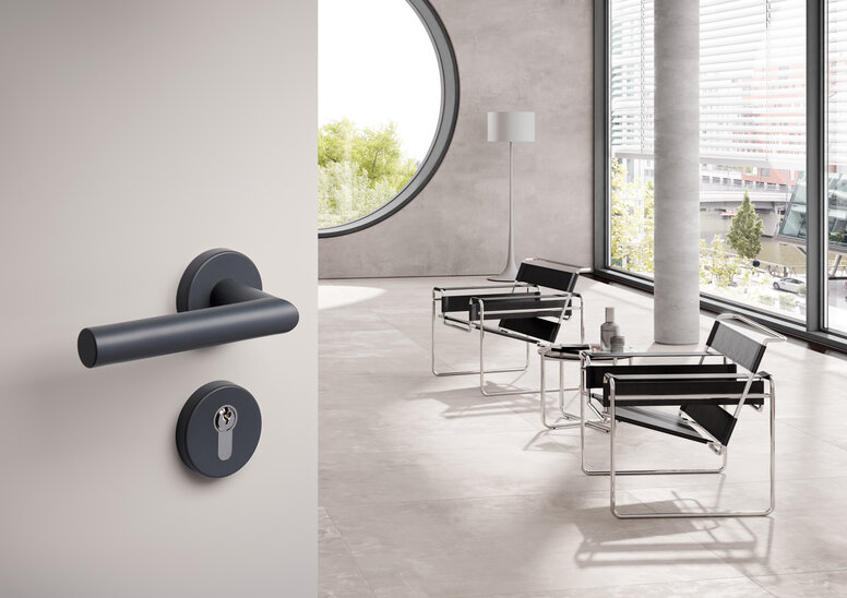 Het ontwerp van de deurgreep wordt een stijlbepalend element op de deur dankzij de bewuste eenvoud. De puristische designoplossing mini reduceert de deurgreep tot het wezenlijke en accentueert op elegante wijze het matzwarte oppervlak.