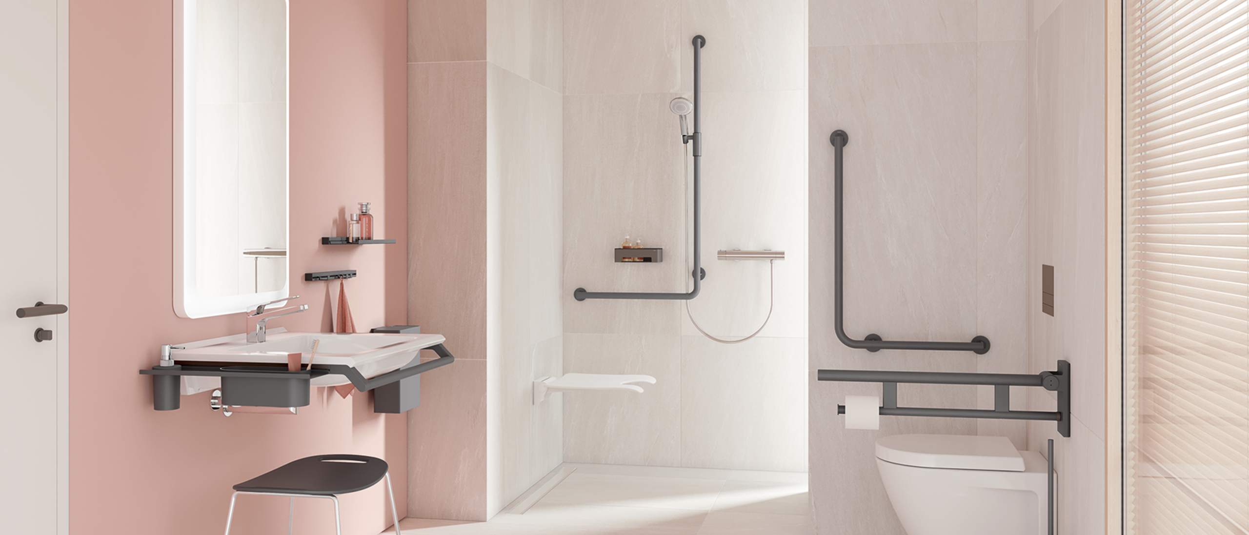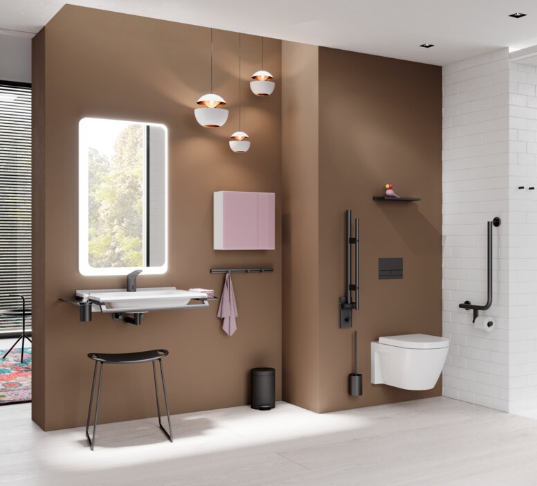 Intelligent kleurontwerp: Qua kleur moeten neutrale tinten overheersen, die de ruimte visueel vergroten en voor helderheid zorgen. Accessoires in contrasterende kleuren kunnen diepte en verfijning toevoegen. System 900 van HEWI is bijvoorbeeld verkrijgbaar in verschillende kleuren - van deurkrukken tot wandsteunen, papierrolhouders en borstelsets tot het wasbaksysteem.