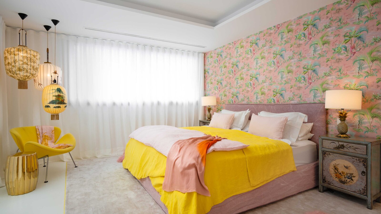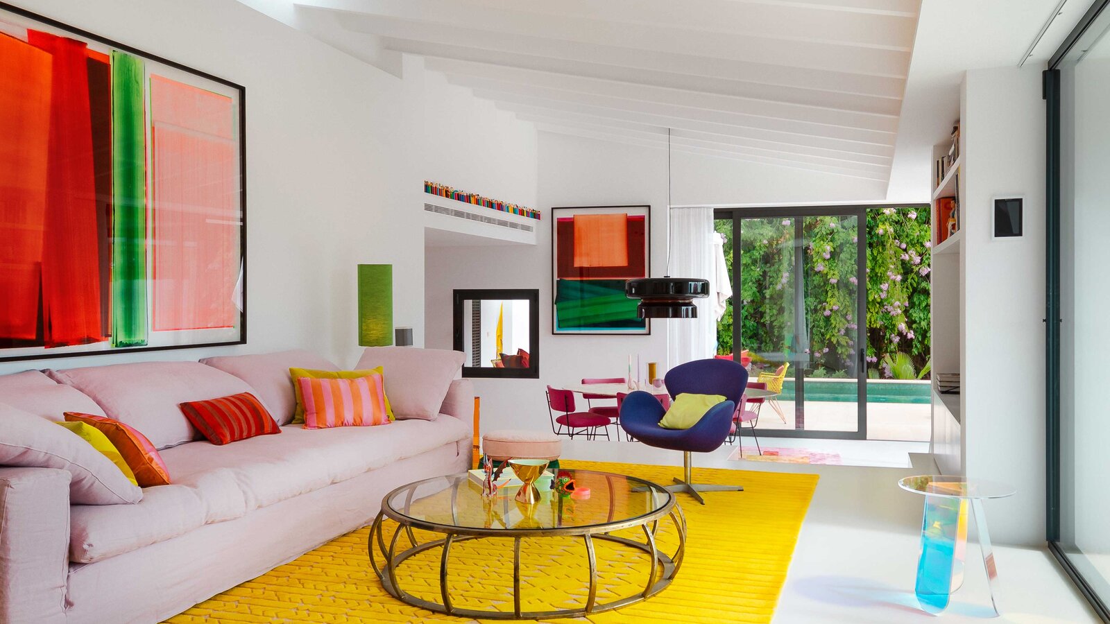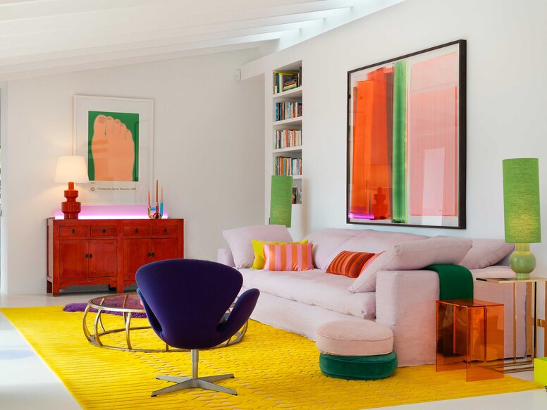 Expressieve gele tonen spelen een centrale rol in het hele arrangement. Door het hele huis vind je stralend gele accenten, die doen denken aan de zon van Mallorca en warmte en aanwezigheid geven aan de kamers. Naast gele tapijten, kussens, stoelen en plaids, is er ook een rijk mosterdgeel te vinden op de deuren in de vorm van HEWI's iconische Systeem 111 voor deurkrukken.