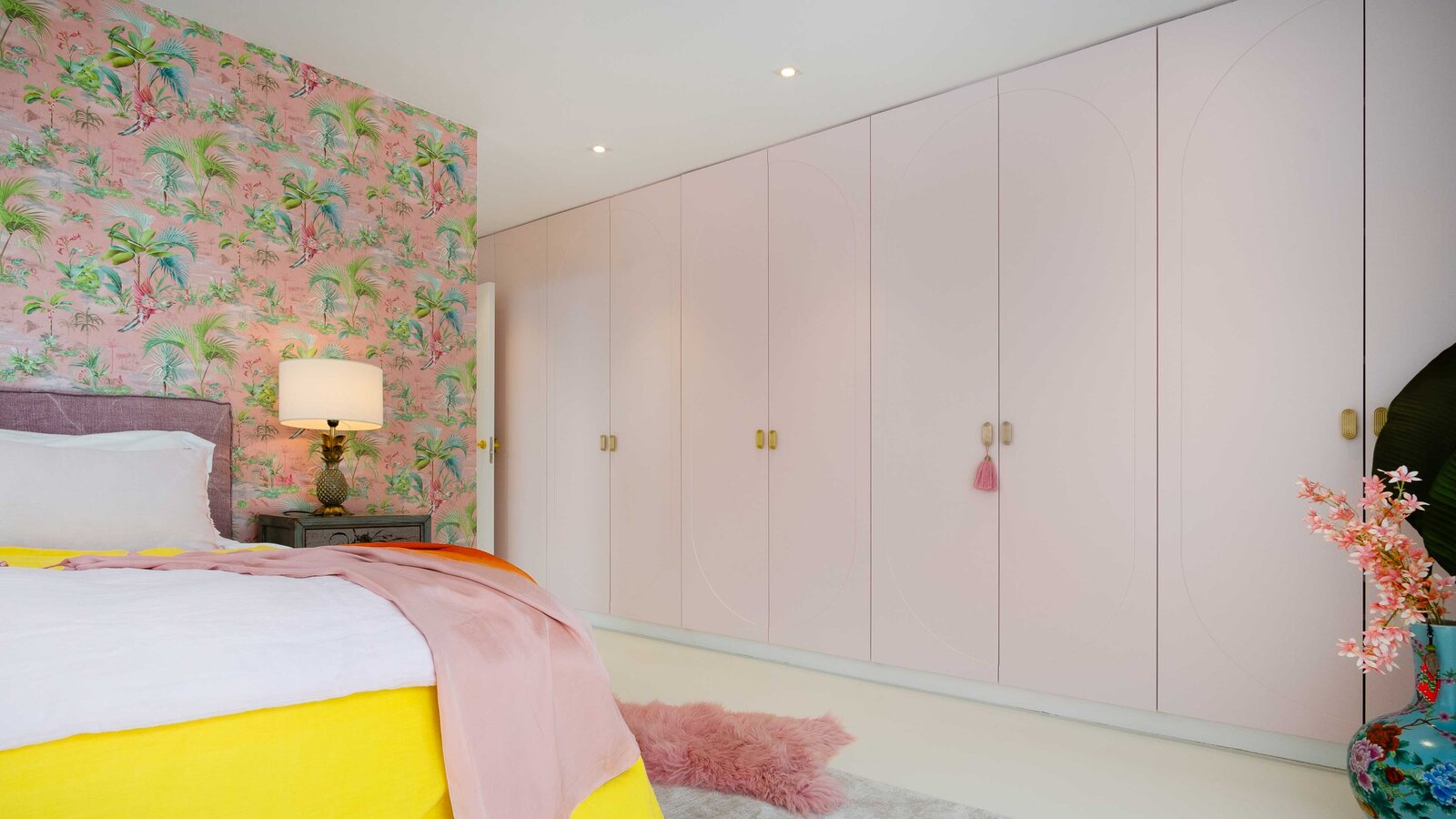 Tegelijkertijd speelt Leja met de harmonie van analoge kleuren, d.w.z. kleuren die dicht bij elkaar liggen op de kleurencirkel en een zeer aangename en evenwichtige uitwerking hebben op het menselijk oog. Grootformaat originelen van Julio Rondo aan de muren, aangepast aan het kleurrijke interieur, verenigen de kleurenharmonie van het complementaire contrast van roze-koraal en gele of roze tinten uit het analoge kleurenschema. Ze pakken ook de kleuren van de vormgeving van het interieur op en gaan de dialoog aan. Op deze manier wordt er een emotioneel ontroerende uitstraling in de kamer gecreëerd. De diversiteit en diepgang van het kleurontwerp zet zich voort in de combinatie van verschillende structuren en materialen. Gladde (plexi)glazen oppervlakken, spiegels en metalen oppervlakken treffen zachte wollen tapijten, pluizige bankkussens en dekens. Met een flinke portie moed, vrije geest en gevoeligheid combineert Leja de meest uiteenlopende materialen en kleuren en zet ze haar visioenen om in expressieve realiteit.