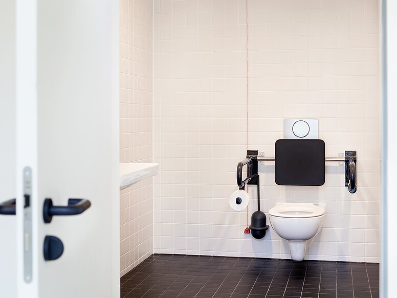 Op de kamerdeuren maakt de klassieke deurkruk van HEWI - Systeem 111 in een matzwarte afwerking - een statement. De tot de essentie teruggebrachte designtaal van de deurkruk past naadloos in de tijdloos moderne architectuur van het ziekenhuis en vormt tegelijkertijd een maximaal kleurcontrast met de witte deuren - soms in combinatie met een ronde WC- of sleutelrozet en in de optionele ruimtes met een elektronische sluitcilinder.