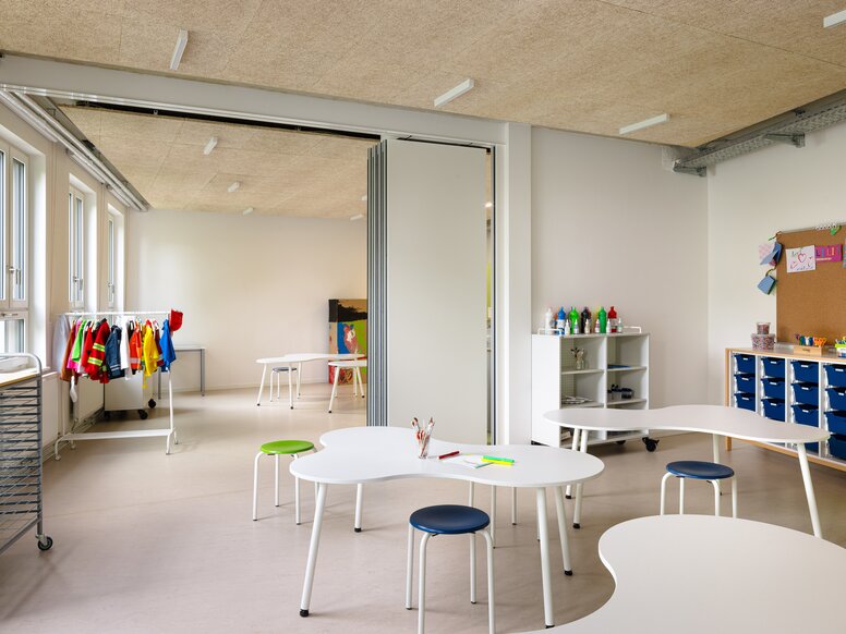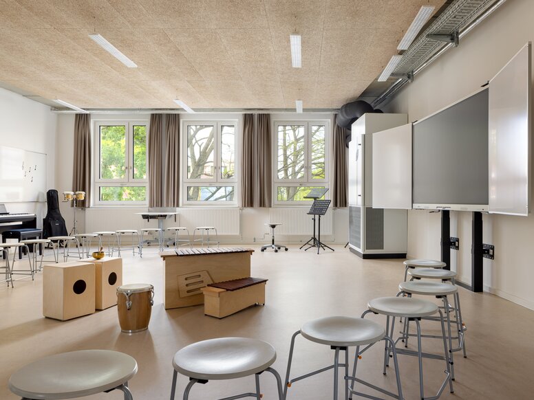 De klaslokalen hebben een ingetogen ontwerp om de concentratie te bevorderen. De brede, aanpasbare gangen bevatten de garderobes en bieden open zones voor studie en onderzoek. Op de begane grond bevinden zich de ruime entree en de kantine, die ook buiten de schooluren gebruikt kan worden vanwege haar ligging in het openbaar toegankelijke deel van het schoolgebouw. Op de 3e verdieping van de kinderopvang kan een open ruimte worden omgebouwd tot een auditorium, dat ook voor grotere schoolevenementen kan dienen. De variabele plattegronden kenmerken de nieuwe gebouwen op alle niveaus en zijn ook van groot belang voor de toegankelijkheid.