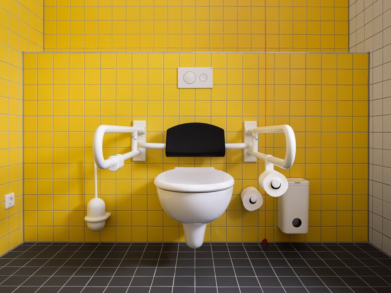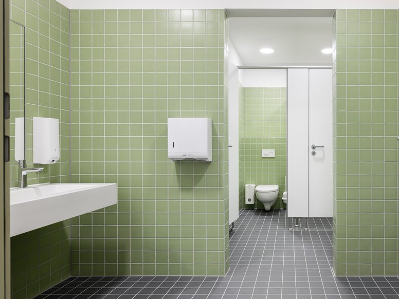 Barrièrevrije ruimtes worden ook in de details benadrukt. In de badkamers is bijvoorbeeld gekozen voor de Serie 801 van HEWI, die al lang marktleider is in het segment van barrièrevrije sanitaire oplossingen. "Het was belangrijk voor ons dat de producten in de Michael Ende Grundschule voldoen aan de behoeften van alle mensen volgens het concept van Universal Design en de hoogste kwaliteit combineren met functionaliteit en esthetiek," aldus Nadya Faris-Bibawi, architect en algemeen directeur van NOKERA Planning, die de keuze voor HEWI toelicht. In de zuiver witte uitvoering passen de oplossingen van HEWI perfect bij de betegelde muren in de hoofdkleuren geel, groen, blauw en rood en plaatsen ze accenten bij de antracietkleurige vloertegels.
