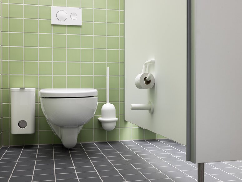 "Wij vinden de spoelactivering bijzonder praktisch. Deze is op de inklapbare steungreep gemonteerd, waardoor u met één druk op de knop kunt doorspoelen terwijl u zit," aldus Nadya Faris-Bibawi. Samen met de accessoires uit de Serie 477 van HEWI, zoals de hygiënecombinatie of de borstelset in het zuiver wit, beschikt de basisschool dankzij HEWI over een systeemoplossing die voldoet aan alle eisen voor de inrichting van barrièrevrije badkamers en die naadloos past in de moderne schoolarchitectuur, die leerlingen en leraren de beste omstandigheden biedt om te leren en les te geven.