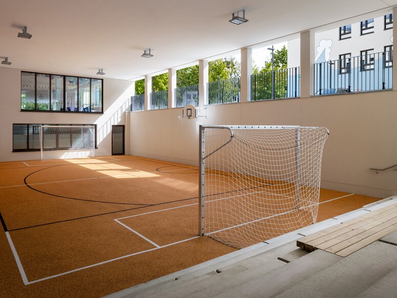Beide gebouwen zijn op de begane grond verhoogd, waardoor mooie, overdekte speel- en pauzezones ontstaan. Onder de gebouwen bevinden zich multifunctionele ruimtes en twee kleine speelvelden, die vanaf het schoolplein toegankelijk zijn via een tribuneachtige trap. De natuurlijke indeling van de activiteitenzones op de begane grond in combinatie met mooie speelzones op het dak is een belangrijk onderdeel van het ontwerpconcept. De vereisten voor de minimale grootte van de open ruimtes waren moeilijk te realiseren op het dichtbebouwde terrein.