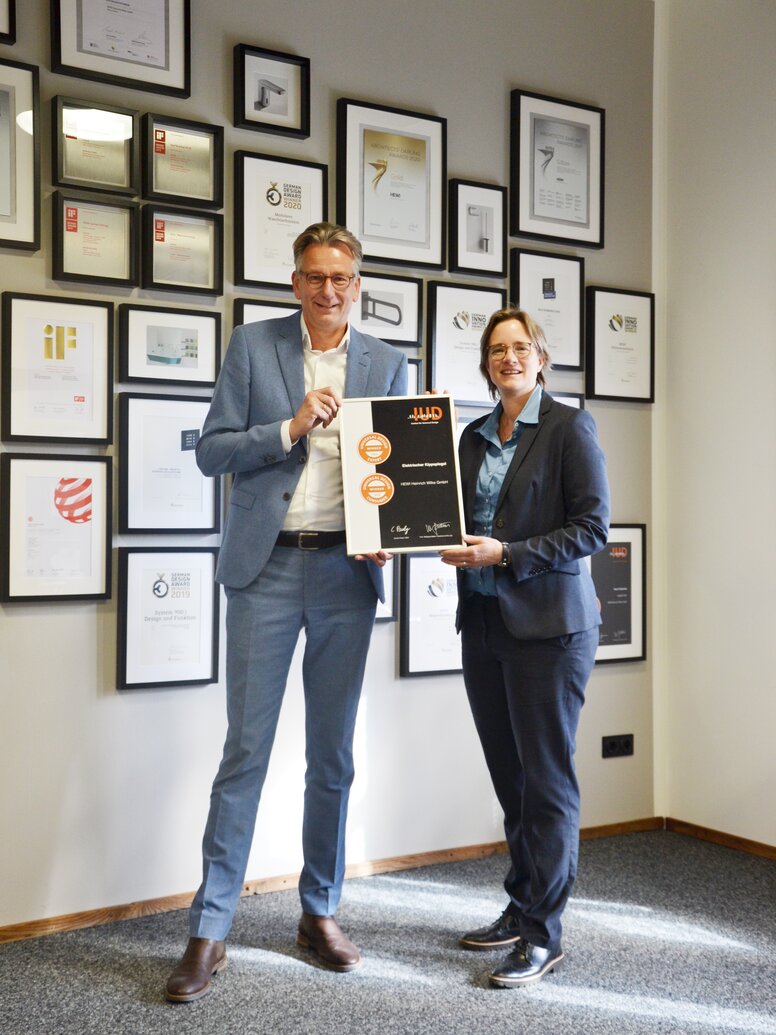 HEWI managing director Thorsten Stute met Carolin Pauly (CEO IUD Instituut voor Universeel Design) in de “Hall of Fame” op de locatie in Bad Arolsen. Het bedrijf, dat gespecialiseerd is in barrièrevrije sanitaire oplossingen, wint elk jaar een aantal belangrijke designprijzen, 7 in totaal in 2024. Waaronder de Universal Design Award.