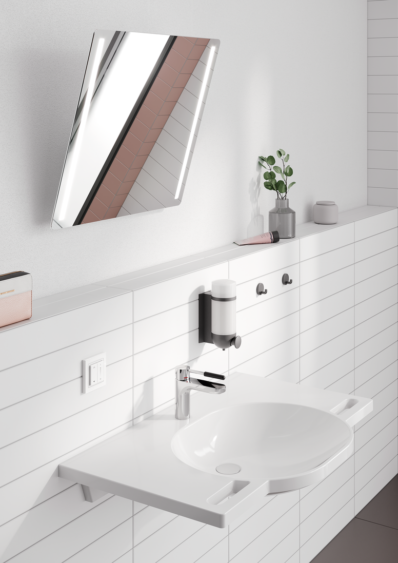 De gemotoriseerde kantelspiegel breidt het bestaande assortiment handmatige kantelspiegels uit. De kantelfunctie is uitgerust met een elektromotor en wordt bediend via een vrij te plaatsen wandschakelaar tot een hoek van 28°. Net als bij de handmatig te bedienen kantelspiegels kunnen gebruikers ook kiezen tussen een niet-verlichte en verlichte versie. Het in- en uitschakelen van de verlichting, de helderheid en de lichtkleur - van warm wit tot koel wit - kunnen traploos worden ingesteld met de aparte drukknop.