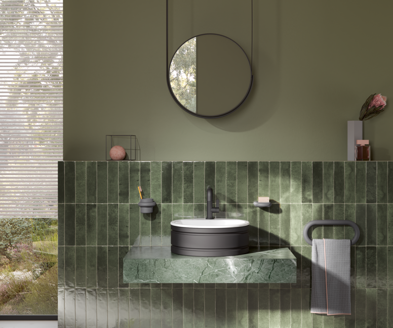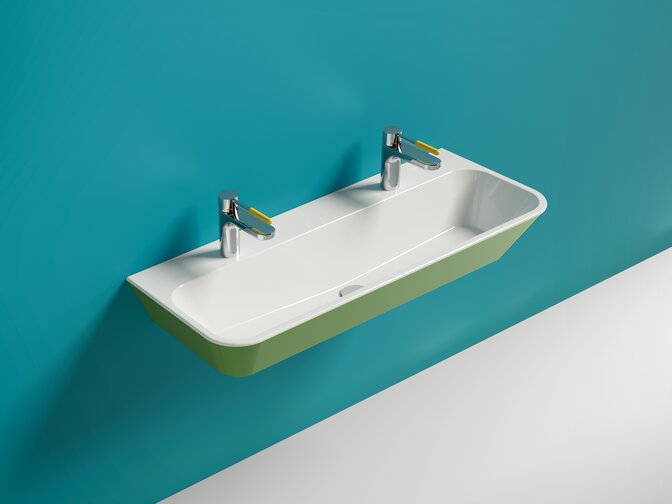 Het innovatieve wastafelconcept maakt het mogelijk om een adaptieve steungreep en een modulair opbergsysteem direct in de wastafel te integreren. Het is verkrijgbaar in drie aantrekkelijke poedercoatingkleuren, die harmonieus passen in verschillende badkamerontwerpen. De hoogwaardige poedercoating geeft de wastafel een elegante uitstraling, maakt het oppervlak bijzonder slijtvast en zorgt bij de greep voor een aangename houvast.