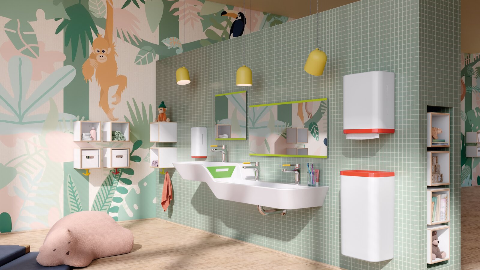 Ook voor kinderen zijn er geschikte producten: De HEWI-wastafels voor kids overtuigen door hun fijne randen, die de veiligheid van de kinderen centraal stellen. Het assortiment omvat naast wastafels ook spiegels. HEWI voldoet daarmee aan de eisen voor productoplossingen voor kinderdagverblijven, crèches en scholen. Naast enkele en dubbele wastafels zijn er ook rijwastafels met hoogteverschillen beschikbaar. Naast klassiek wit biedt HEWI een tweekleurige variant in vrolijk appelgroen of stralend aquablauw.